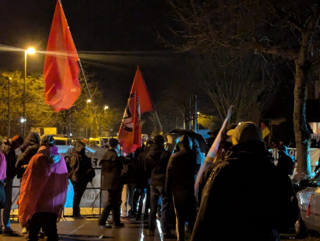 Nachdem sich die Lage etwas entspannt hatte begann die Kundgebung in Sicht- und Hörweite der eintreffenden AfD-Anhänger:innen. In Redebeiträgen der Autonomen Antifa-Koordination Kiel, des Offenen Antifa-Treffen Kiel sowie Antifaschistischer Gruppen aus Schleswig-Holstein wurde die Dringlichkeit von Gegenwehr gegen AfD und Rechtsruck in Krisenzeiten, insbesondere vor den anberaumten Neuwahlen, betont. Des weiteren wurde darauf hingewiesen, dass der Auto-Schuppen von „Basis“-Mitglied Sönke Hoffmann mittlerweile regelmäßig für rechte Veranstaltungen zur Verfügung steht und damit als etablierter Treffpunkt der Szene zu gelten hat. Rythems of Resistance sorgten mit Trommelbeiträgen dafür, dass das Ausharren im dunklen Gewerbegebiet sich trotz nasskaltem Wetter erträglicher gestaltete.