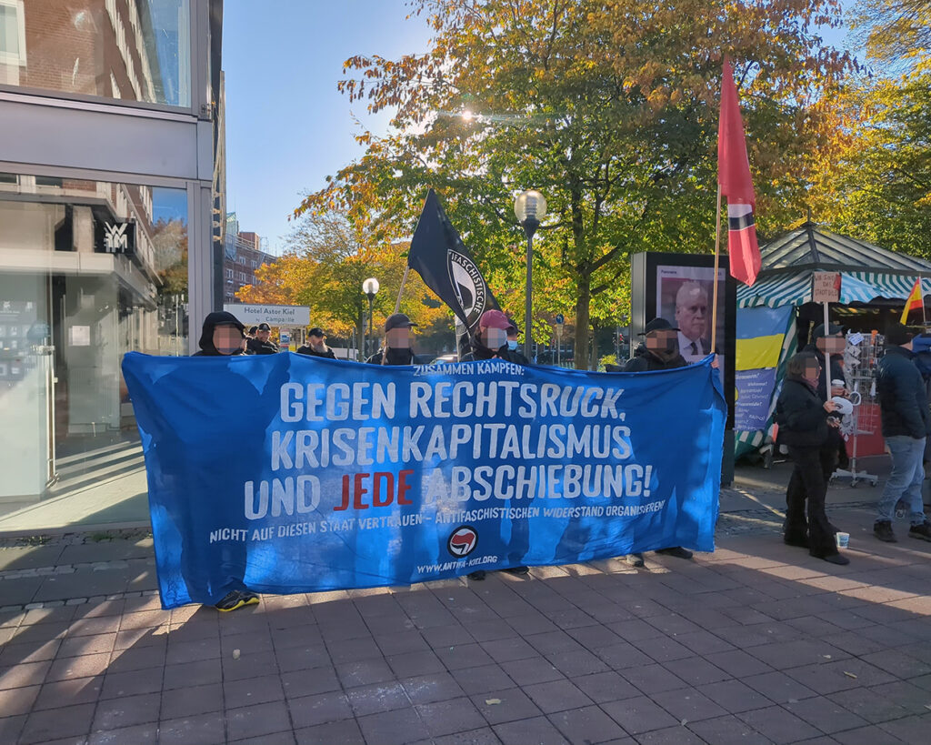 Festzustellen war am Wochende weiterhin, dass die neue Mehrgleisigkeit der Kieler AfD im Wahlkampf auch diesmal nur mit Unterstützung auswärtiger Verbände möglich gewesen ist. Lokale Parteimitglieder waren bei den Auftritten in der Minderheit. Nichtsdestotrotz stellt die ambitionierte rechte Raumnahme eine Herausforderung für Kieler Antifaschist:innen dar, die in den kommenden Wochen nur angemessen beatwortet kann, wenn viele Antifas insbesondere an den Samtagvormittagen aufmerksam und spontan handlungsfähig sind.