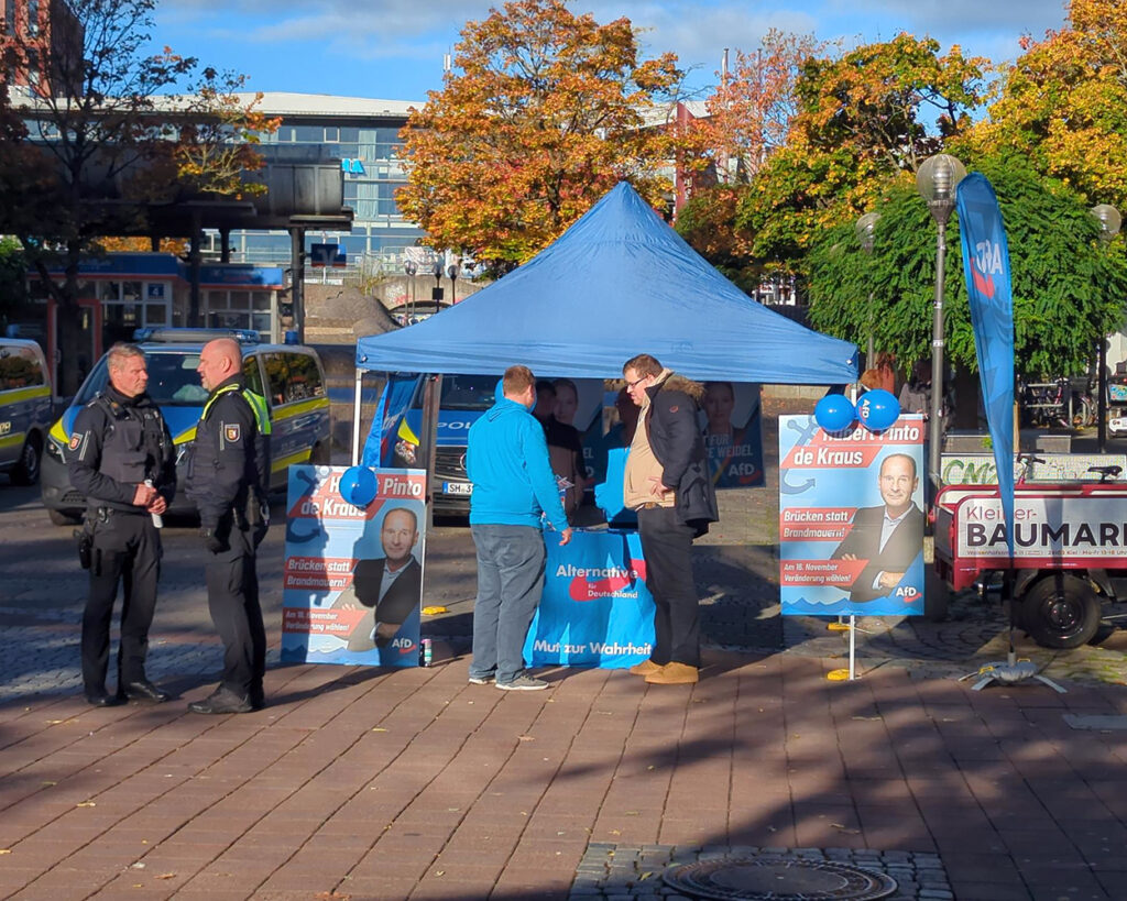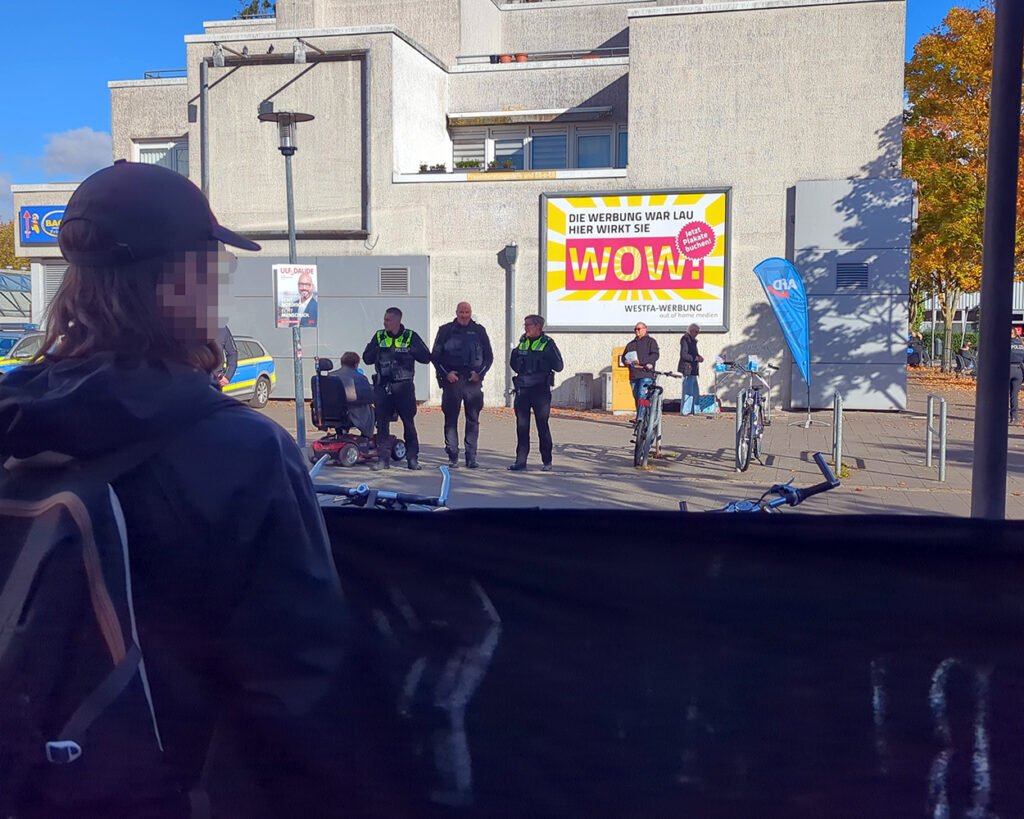 Um kurz nach 11 Uhr stellten zwei weitere AfDler:innen zudem unter Polizeischutz einen weiteren Tisch am Kurt-Schumacher-Platz auf. Auch im dem Zentrum entlegenen Stadtteil Mettenhof waren schnell 10 Gegendemonstrant:innen zur Stelle, die Widerspruch zur rechten Wahlwerbung bezogen. Hier war gegen 13.30 Uhr Schluss.