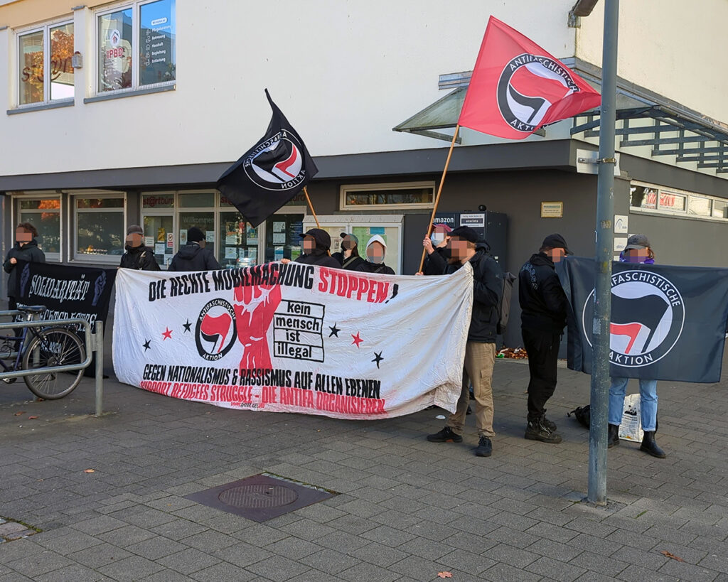 Am Europaplatz waren Hubert Pinto de Kraus, Oberbürgermeister-Kandidat der AfD, und vier weitere Wahlkämpfer:innen bereits gegen 9.30 Uhr präsent, wurden jedoch schnell von etwa 15 Antifaschist:innen begleitet, die in Sichtweite mit Transparenten und Flyern Stellung gegen die rechte Propaganda in der Fußgänger:innenzone bezogen. Auch die Polizei war von Anfang an mit Kräften vor Ort und schützte den AfD-Auftritt, hielt sich aber in Relation zum zuletzt teils brutalen und schikanösen Vorgehen gegen Antifas weitestgehend zurück. Das Szenario dauerte bis 14 Uhr an, als die AfD sich endlich zurück zog. Auffällig war, dass die AfD, anders als in Vergangenheit üblich, durchaus auf reges Interesse und Zuspruch bei einem Teil der Passant:innen stieß. Viele andere erklärten sich dagegen solidarisch mit den Antifas.