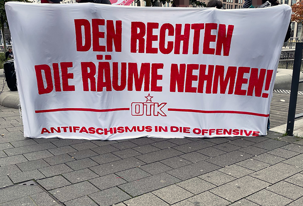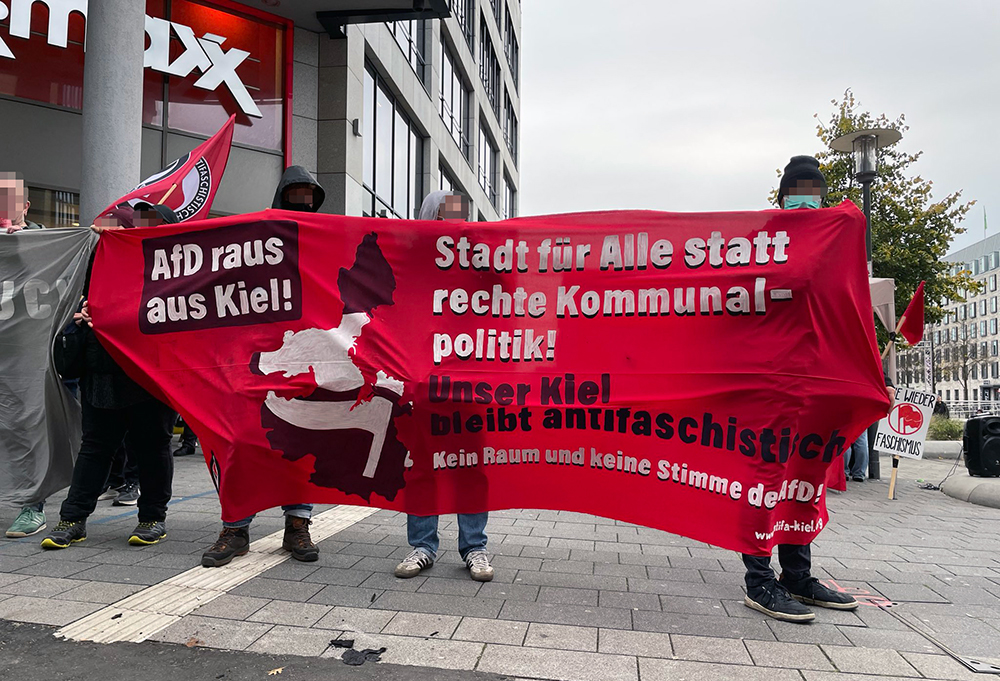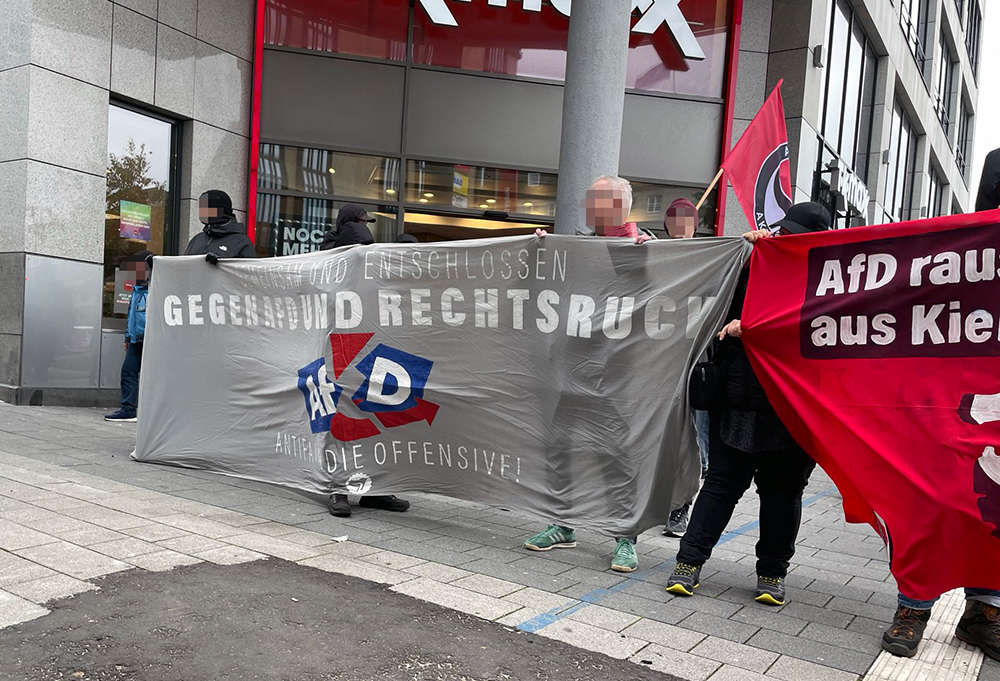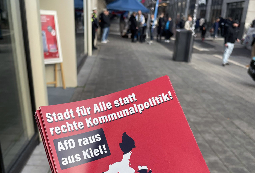 Am Samstag (01.11.2025) standen hier insgesamt etwa 50 Antifaschist:innen über vier Stunden 4-6 Rechten gegenüber. Ohne die Unterstützung der angereisten Parteikollegen aus Kaltenkirchen und vier Wagenladungen Bereitschaftspolizei wäre das Szenario für die AfD sicherlich nicht ohne weiteres aufrecht zu erhalten gewesen, unter diesen Bedingungen bauten die Antifaschist:innen kurzerhand ihren eigenen Stand auf, hielten Redebeiträge, dudelten Musik und verteilten hunderte Flyer gegen die AfD-Hetze. Auch wenn die AfD, wie zuletzt zunehmend festzustellen, bei Teilen der Passant:innen wiederholt durchaus auf Zuspruch traf, wurde ihr Tisch zwischenzeitlich überraschend durch Eigeninitiative aus der Bevölkerung abgeräumt. Es blieb also trotz der Länge des Aufenthalts unterhaltsam und anders als an den Samstagen zuvor wurden über den Tag auch keine weiteren AfD-Wahlkampfaktivitäten vermeldet, so dass sich Kieler Antifaschist:innen diesmal vereint auf einen Schauplatz konzentrieren und die Rechten mit aktivem Widerspruch konfrontieren konnten.