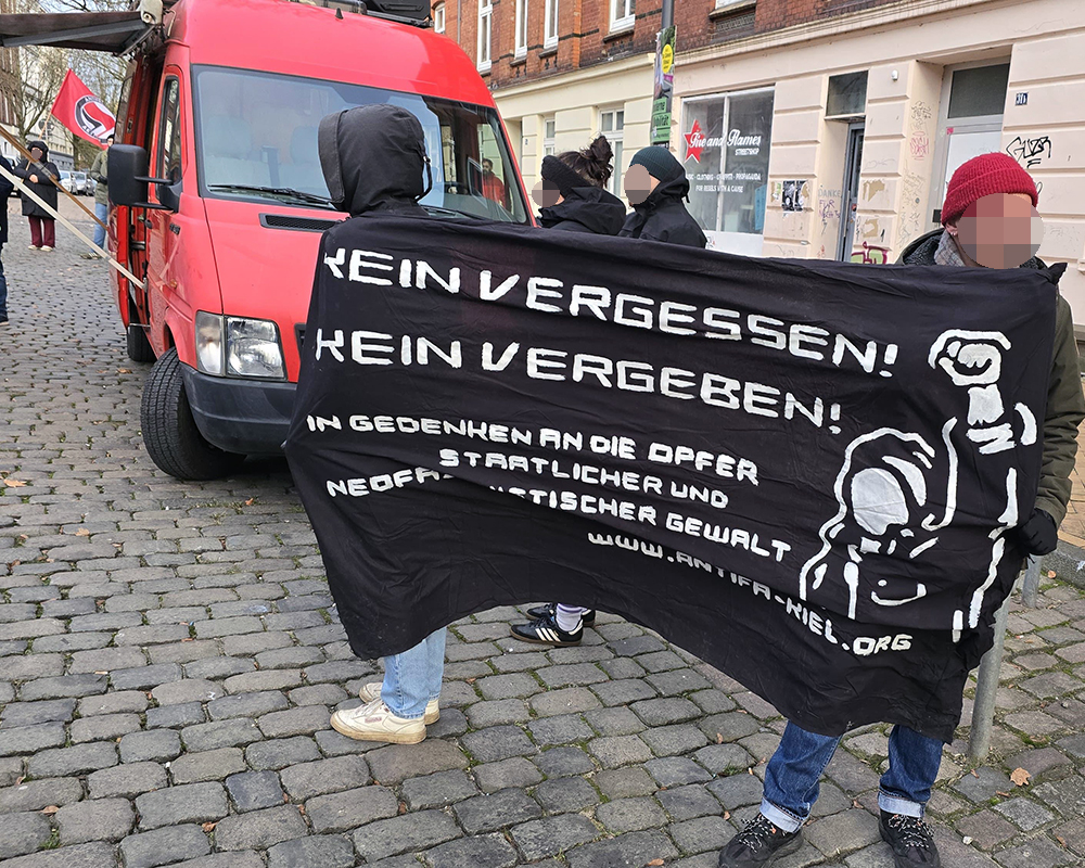 Anlässlich des Jahrestags der rassistischen Mordanschläge von Mölln 1992 versammelten sich am kalten Sonntagnachmittag (23.11.2025) bis zu 80 Antifaschist:innen auf dem Bahide-Arslan-Platz in Kiel-Gaarden. Parallel zu den Gedenkaktivitäten der Familien Arslan und Yilmaz in Mölln rief der Runde Tisch gegen Rassismus und Faschismus wie mittlerweile jedes Jahr auch zu einer Gedenkkundgebung in Kiel auf.