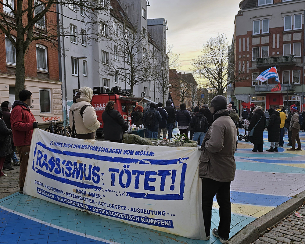 Am 23.11.1992 ermordeten Neonazis bei dem Brandanschlag in der Möllner Mühlenstraße die 14-jährige Ayşe Yılmaz, die 10-jährige Yeliz Arslan und ihre 51-jährige Großmutter Bahide Arslan. Die Tat löste eine Welle der Solidarität, aber auch eine bis heute andauernde Entmündigung und respektlose Behandlung der Betroffenen durch Stadt und Behörden aus.