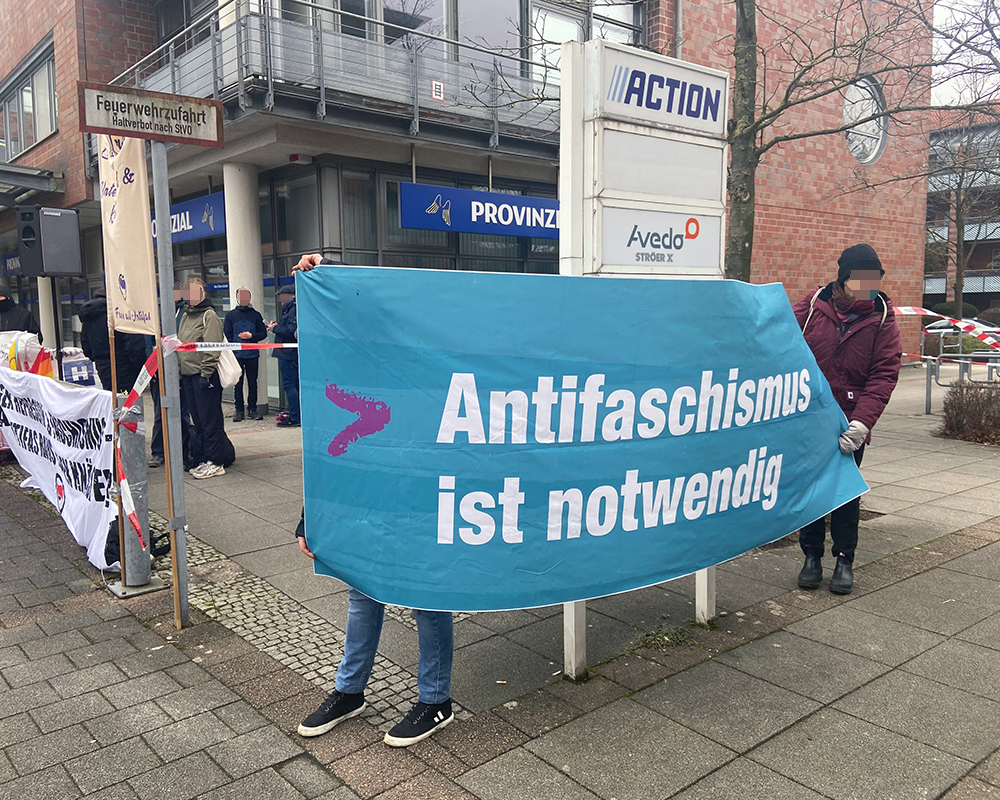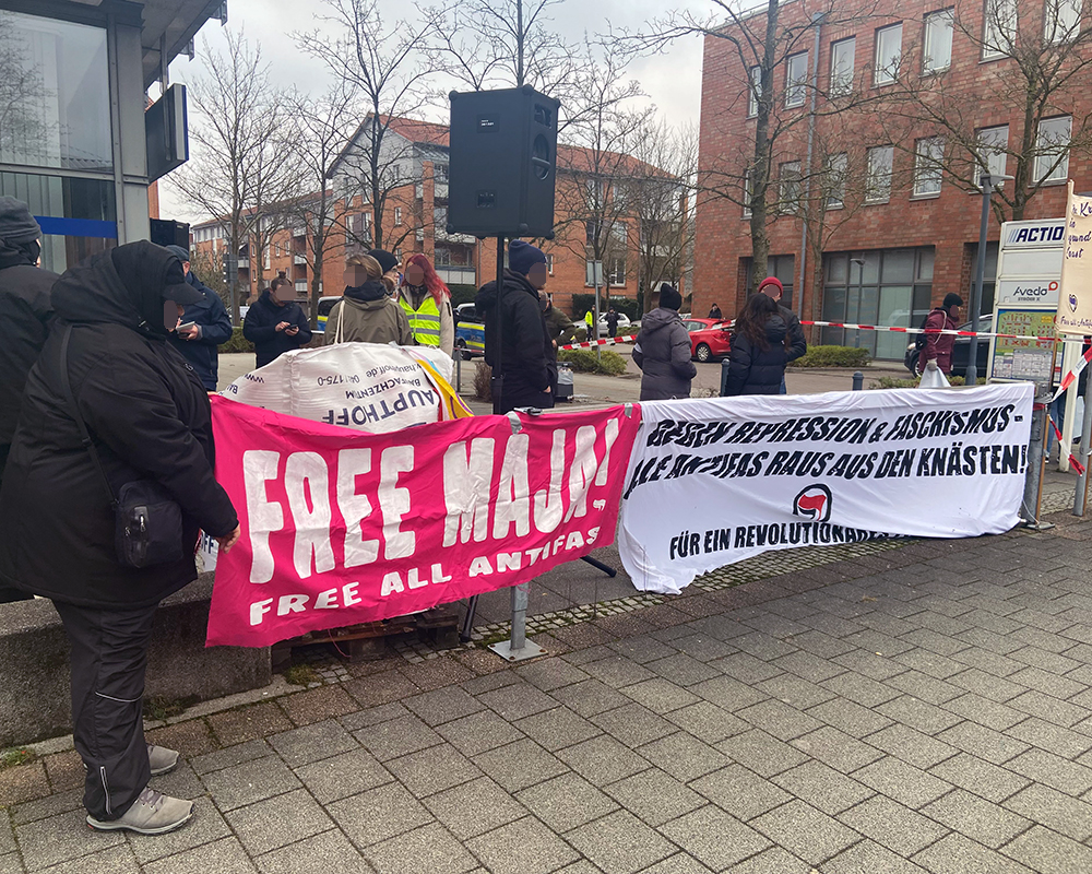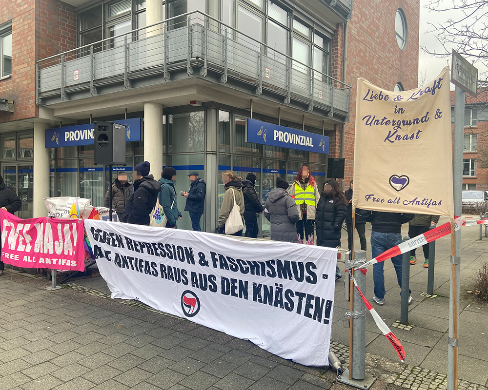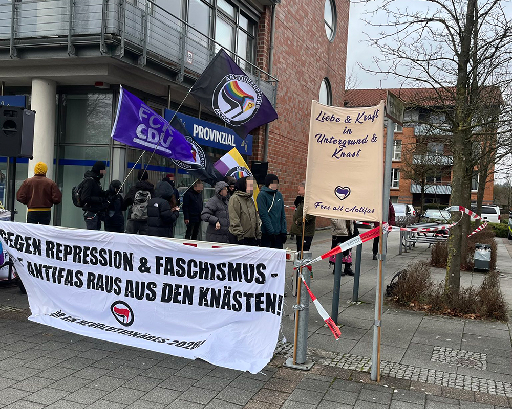 Etwa 20 Antifaschist:innen beteiligten sich am frühen Sonntagnachmittag (18.01.2026) an einer Kundgebung vor dem Mercator Hotel in Itzehoe, in welchem zu diesem Zeitpunkt der Neujahrsempfang der CDU Schleswig-Holstein stattfand. Trotz der parallel stattfindenden Neugründung der schleswig-holsteinischen AfD-Jugend („Generation Deutschland“) in Neumünster, gegen die es kurzfristig eine breite parallele Mobilisierung gegeben hatte, ließen es sich einige Antifas nicht nehmen, im Rahmen der Aktionswoche für die in Ungarn inhaftierte Antifaschist:in Maja das Stelldichein der Landes-CDU zu stören. Hintergrund war der hohe Besuch des Bundesaußenministers Johann Wadephul, dem unmittelbar zuständigen Amtsinhaber für die seit Langem geforderte Rückholung Majas.