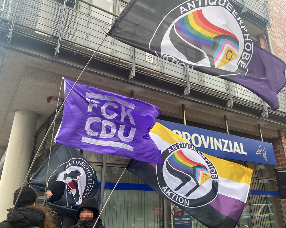Nach rund einer Stunde packten die Antifaschist:innen ihre Sachen, nachdem kein:e CDU-Besucher:in unbehelligt an der Protestkundgebung vorbeigekommen war. In den kommenden Wochen wird das Urteil gegen unsere Genoss*in Maja erwartet. Haltet Augen und Ohren offen für weitere Ankündigungen solidarischer Aktionen und werdet selbst aktiv.