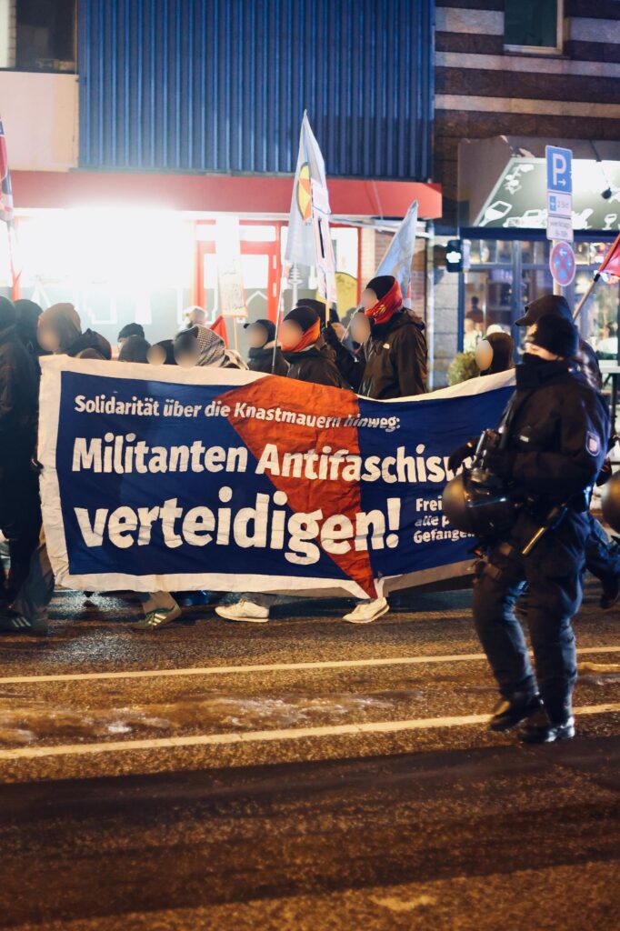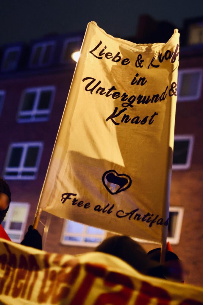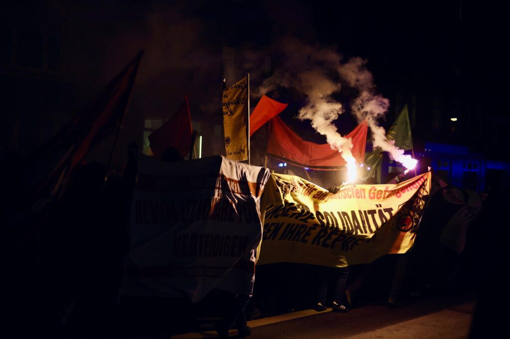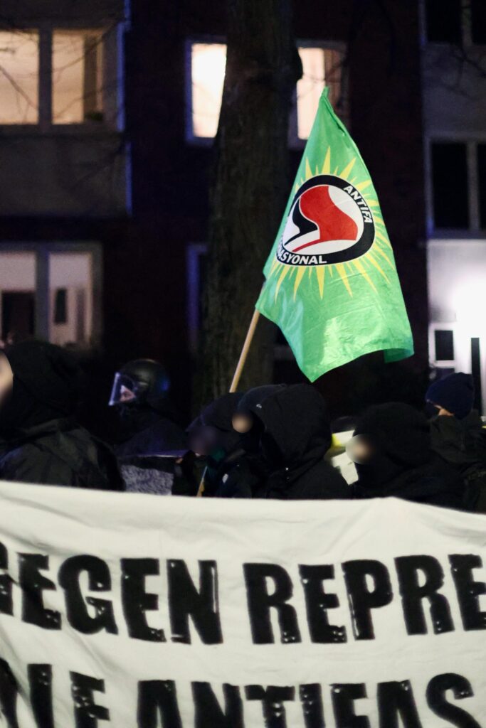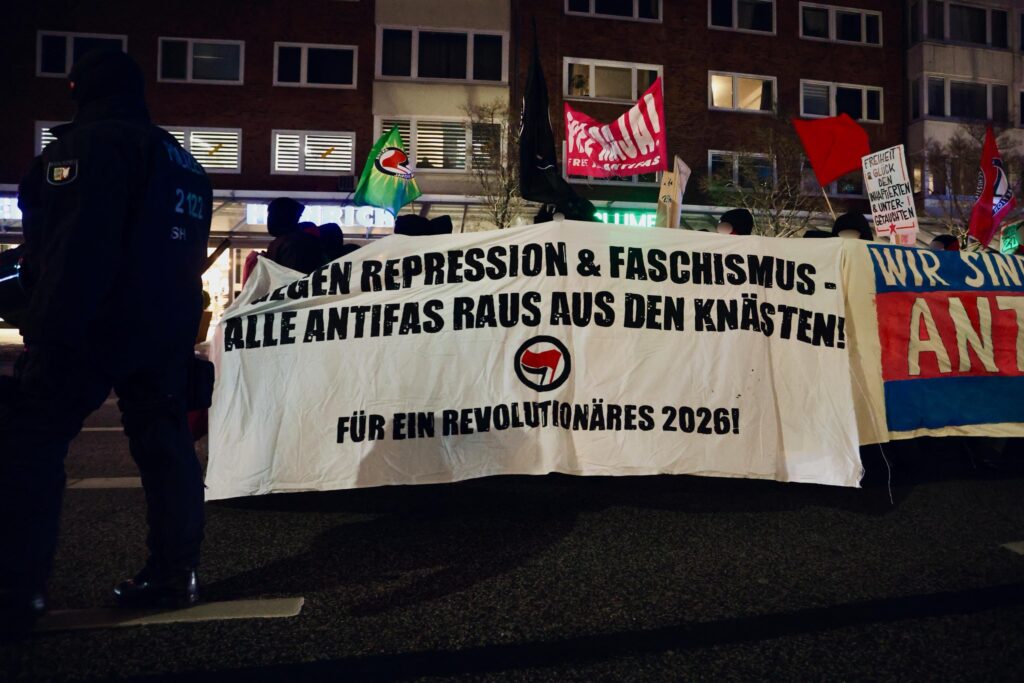 Nach einem Auftaktredebeitrag der Autonomen Antifa-Koordination Kiel, der die unbedingte Notwendigkeit von Solidarität mit denjenigen Genoss:innen betonte, die die staatliche Repression gegen die Bewegung mit voller Härte konkret abbekommen und hinter Gittern absitzen müssen, zog die Demo unter lauten Parolen und gelegentlichen Megaphondurchsagen die Holtenauer Straße hinauf und über die Waitzstraße und den Knooper Weg zum Exerzierplatz. Nachdem zwischenzeitlich bengalische Fackeln die dunklen Straßen erleuchtet hatten, belagerte die Polizei den Zug bis zum Abschluss mit engem Spalier, weitergehende repressive Maßnahmen blieben jedoch aus.