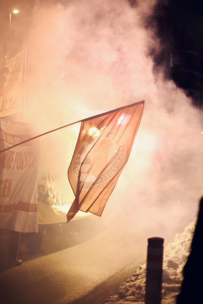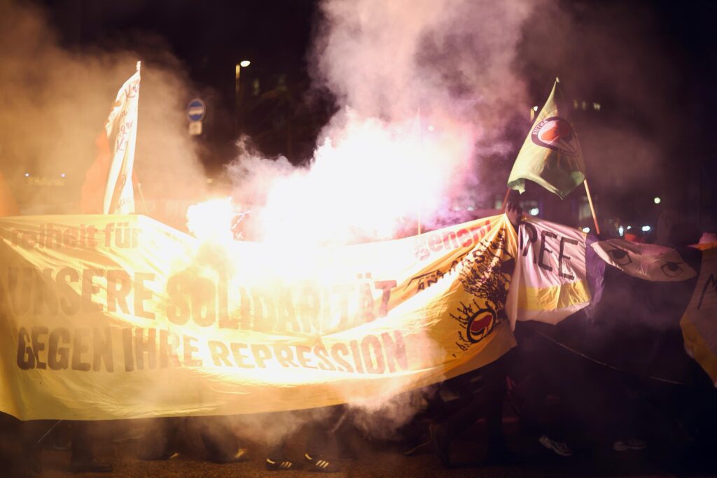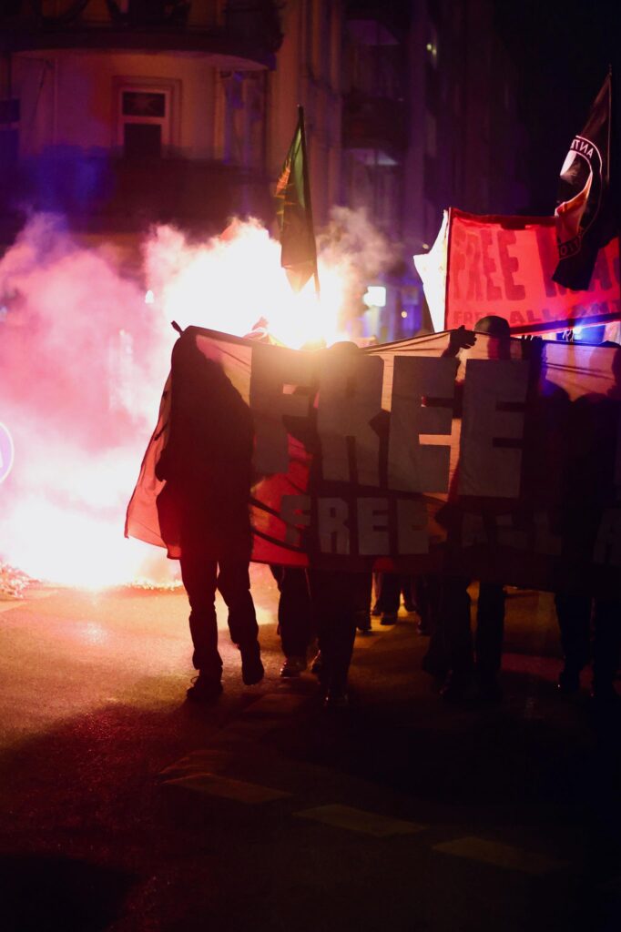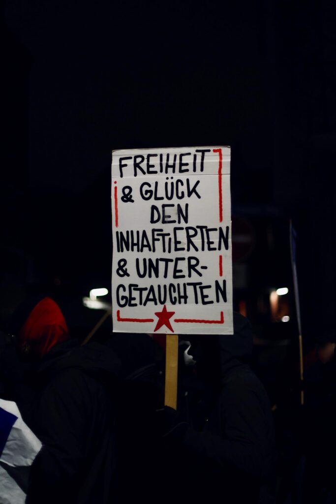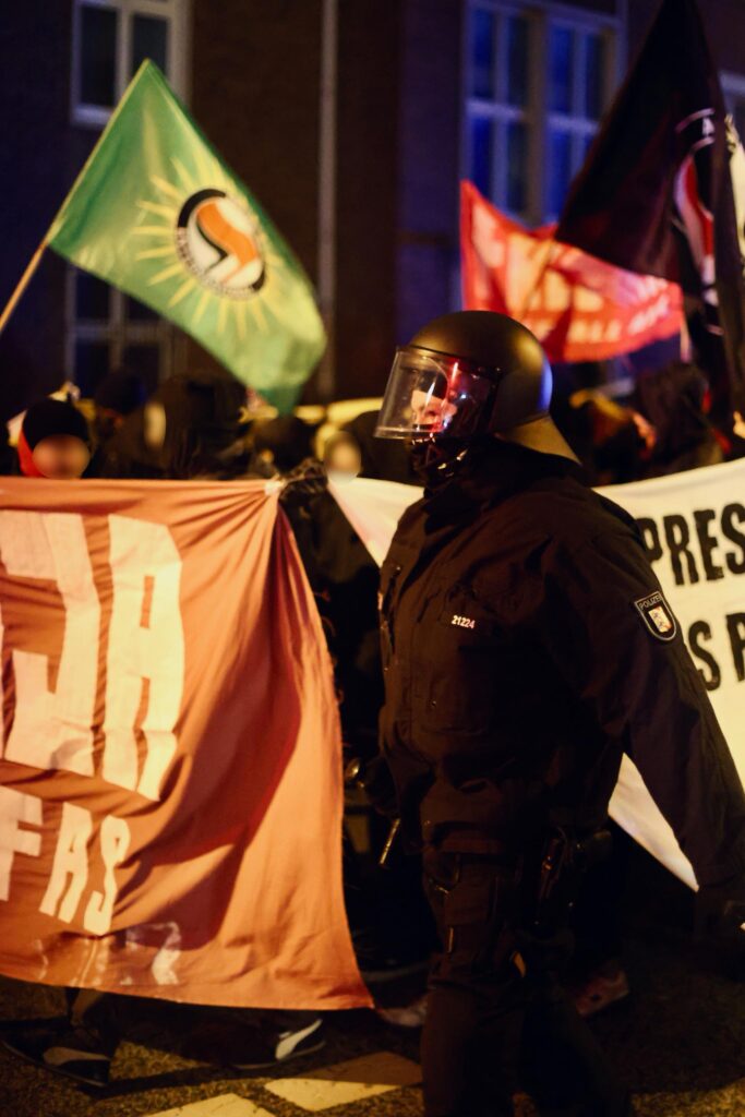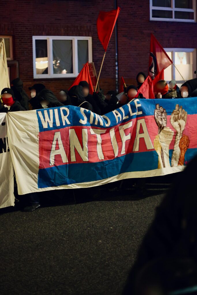 Nach einem Auftaktredebeitrag der Autonomen Antifa-Koordination Kiel, der die unbedingte Notwendigkeit von Solidarität mit denjenigen Genoss:innen betonte, die die staatliche Repression gegen die Bewegung mit voller Härte konkret abbekommen und hinter Gittern absitzen müssen, zog die Demo unter lauten Parolen und gelegentlichen Megaphondurchsagen die Holtenauer Straße hinauf und über die Waitzstraße und den Knooper Weg zum Exerzierplatz. Nachdem zwischenzeitlich bengalische Fackeln die dunklen Straßen erleuchtet hatten, belagerte die Polizei den Zug bis zum Abschluss mit engem Spalier, weitergehende repressive Maßnahmen blieben jedoch aus.