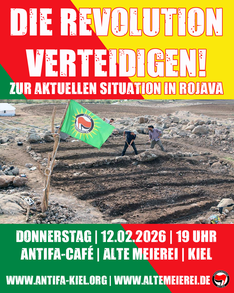 Im Antifa-Café wollen wir einen Einblick in die aktuelle Situation in Nordostsyrien geben. Anhand von kurzen Videos und Inputs wollen wir aufzeigen, warum die Rojava ein zentraler internationaler Bezugspunkt für uns als revolutionäre Linke ist, welche reaktionären und imperialen Interessen und Widersprüche sich in dieser Region konzentrieren, zwischen denen sich die autonome Selbstverwaltung permanent behaupten muss, und wie die aktuelle humanitäre und politische Lage vor Ort ist. Natürlich wollen wir dann auch gemeinsam diskutieren, wie wir als Linke in Kiel dazu beitragen können, die Revolution in Rojava zu verteidigen.