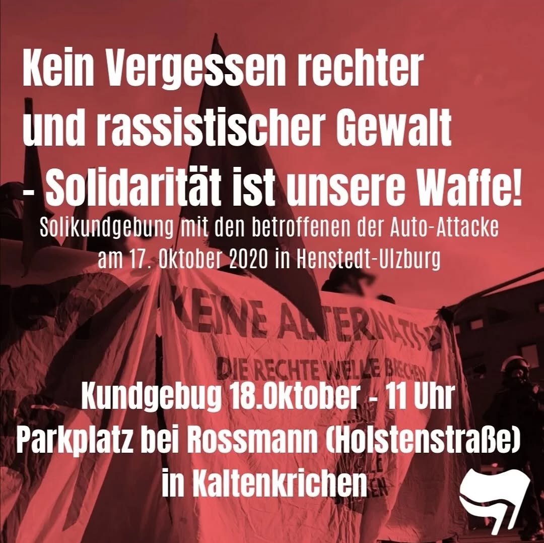 „Am 17. Oktober 2020 ist Melvin S., Neonazi und damaliges AfD-Mitglied, in Henstedt-Ulzburg absichtlich in vier Antifaschist*innen gefahren, die sich auf dem Gehweg befanden und verletzte sie zum Teil schwer.